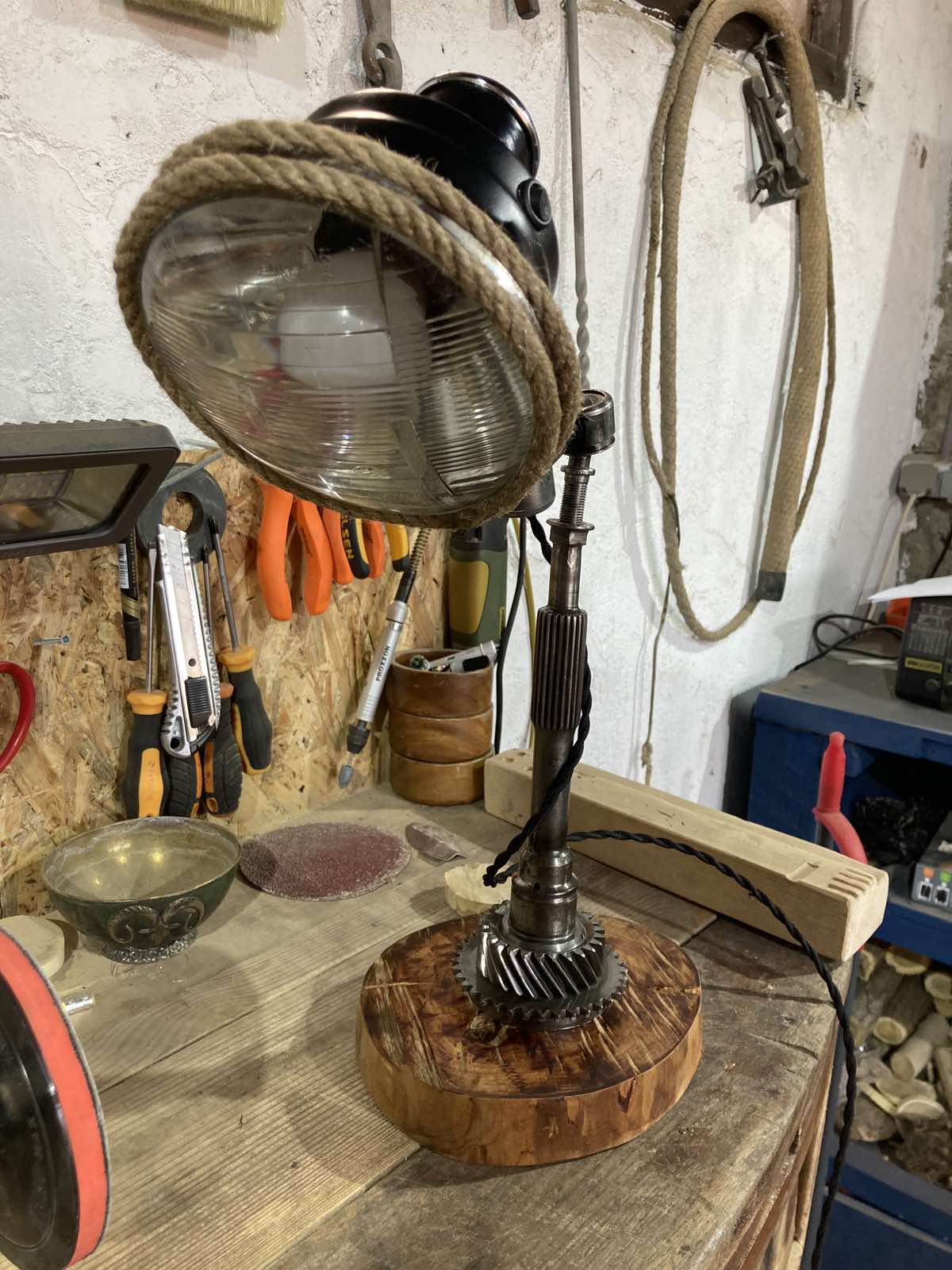 მაგიდის ნათურა. დამზადებულია მანქანისა და სხვადასხვა ორიგინალური ნივთებისგან. მუშაობს 220 ვ.